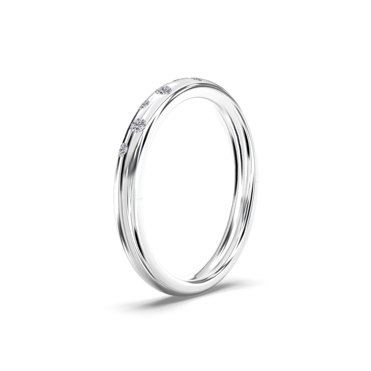 The Glimmer band features a 2mm width with 11 scattered round diamonds. This whimsical and delicate design adds a subtle sparkle to any ensemble. Available in white gold, rose gold, yellow gold, and platinum.