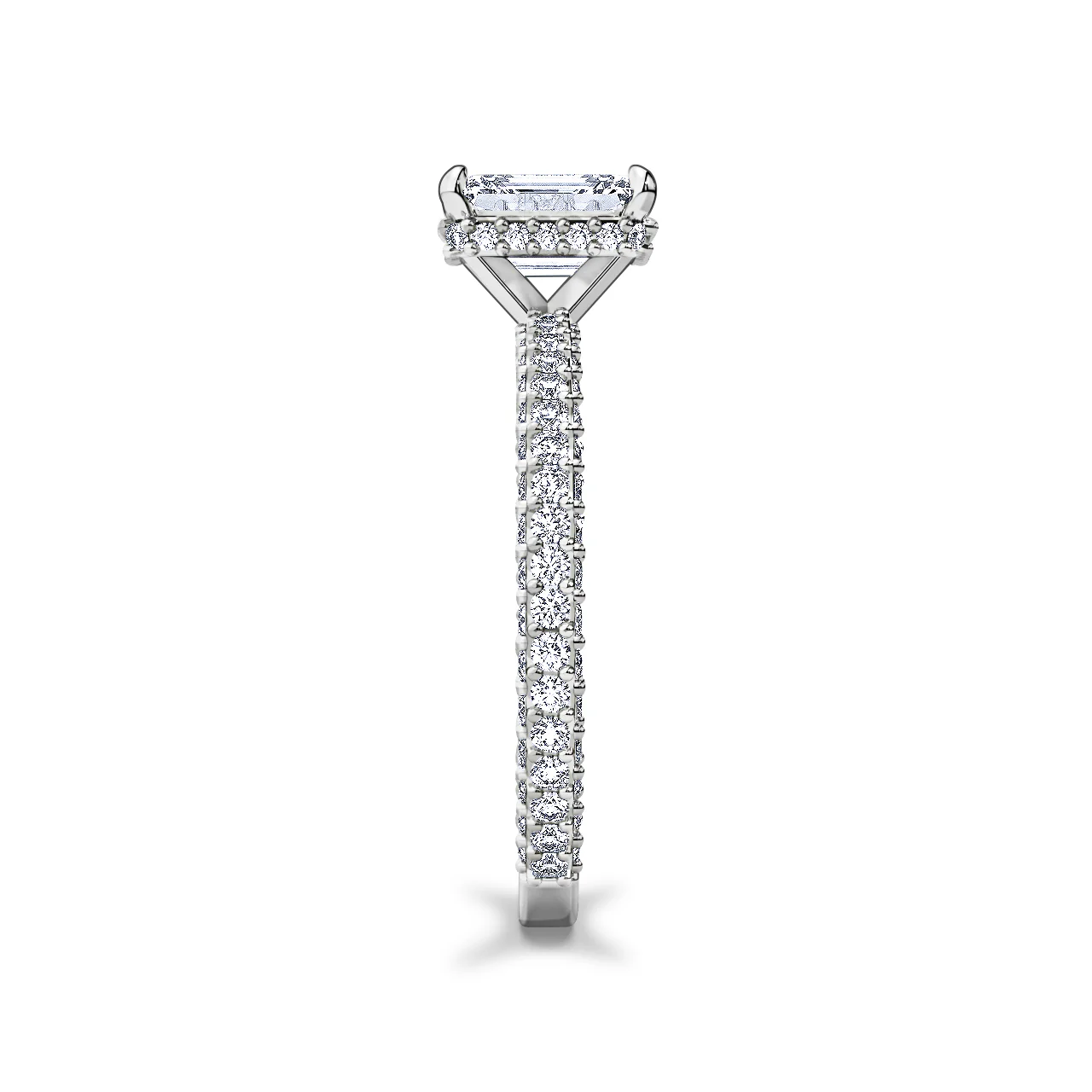 Le Grandeur is a masterpiece of design and craftsmanship, offering a unique twist on traditional elegance. This exquisite solitaire engagement ring is available in Emerald, Oval, and Radiant cuts, each chosen to maximize the stone’s visual impact. The ring features a hidden diamond halo beneath the main setting and innovative 3D side diamonds that add depth and brilliance from every angle.