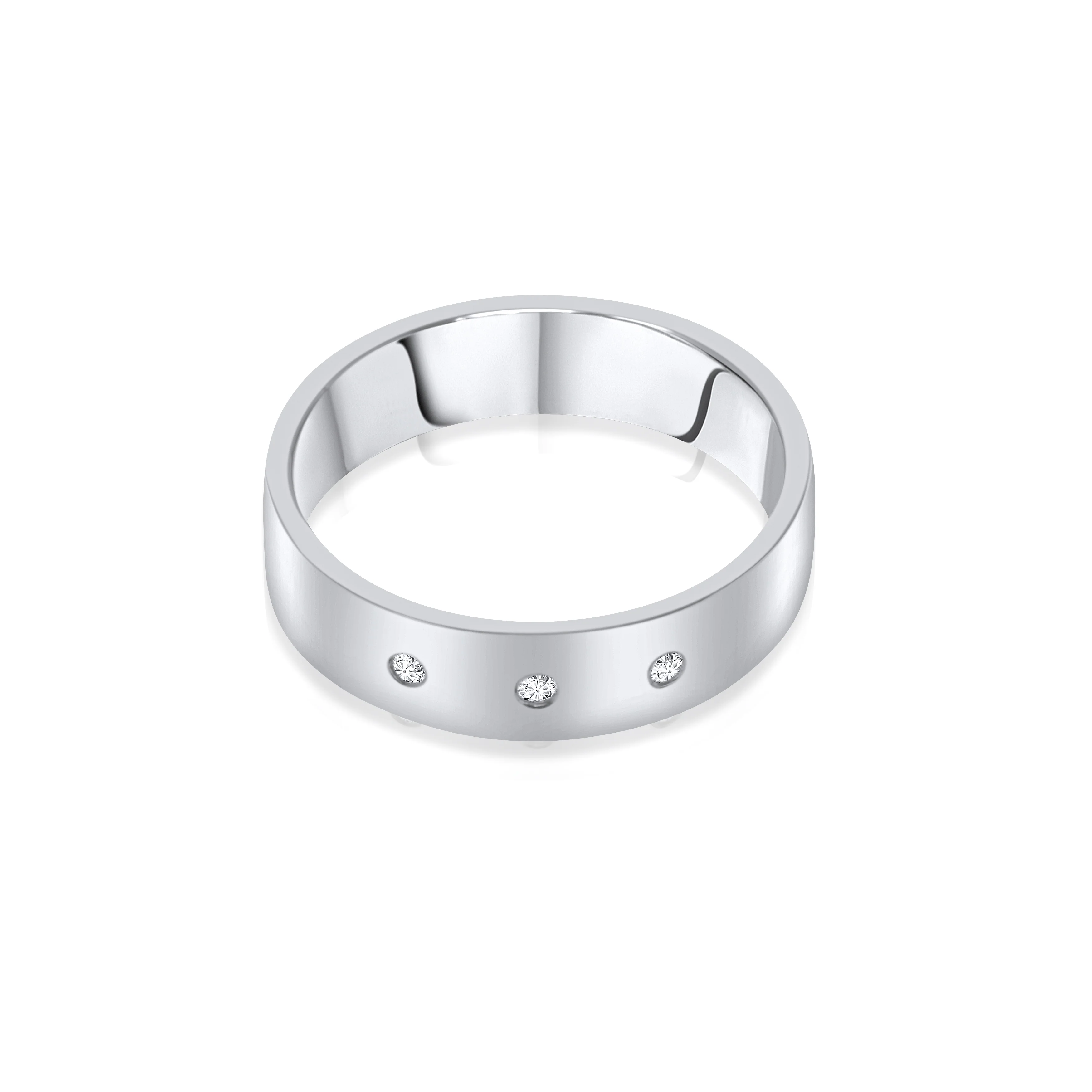 - Design: Three round diamonds set on a polished flat comfort profile for a refined and elegant look.